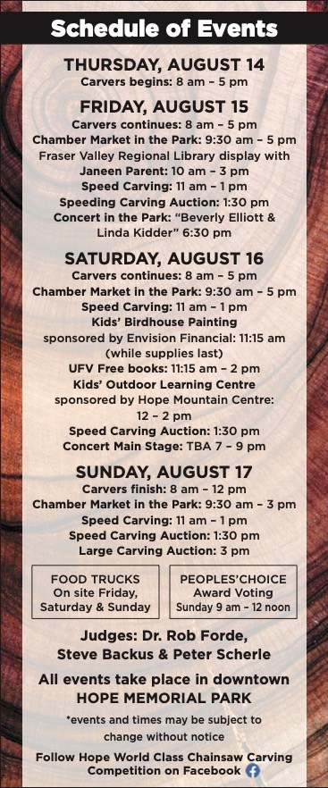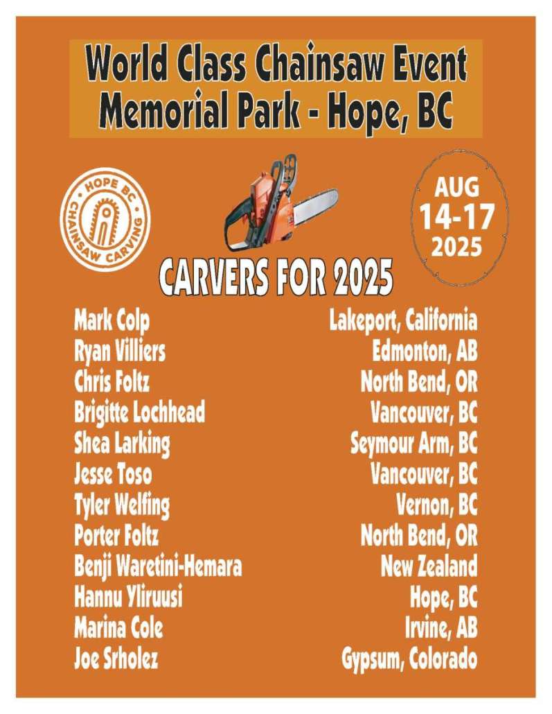 Hope will once again be hosting their chainsaw carving competition this August in Hope’s Memorial Park, you’ll be able to get your front row seat to world class carvers and the amazing creations that they will carve!